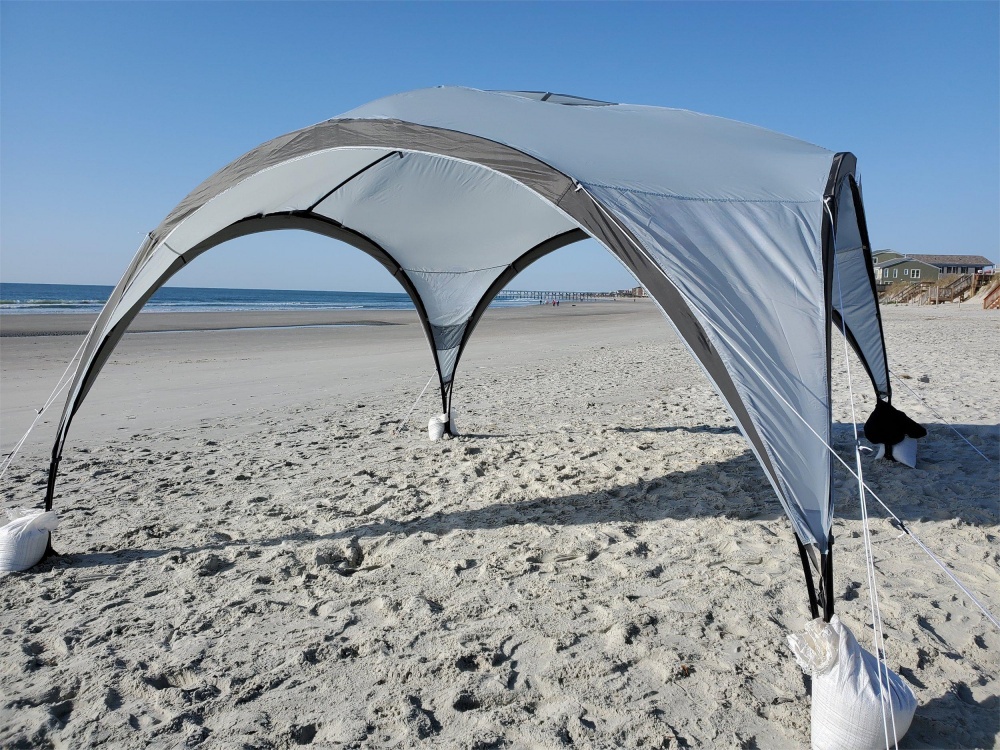 Features: Lightweight, portable, UPF 50+ protection, anchored with sandbags.