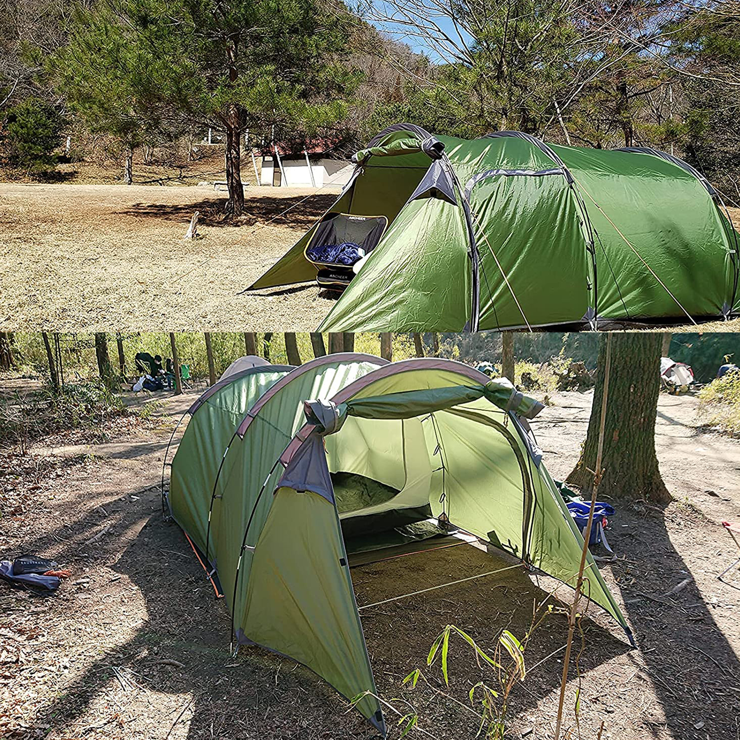 [Detachable Bedroom] – This tunnel tent has a tunnel outer layer and a detachable inner layer, make it has multi-functions. Hang up the inner layer as a bedroom, the left area as a living room, dividing the tent as a 2 room tent. You can sleep the bedroom and the living room is spacious enough to take a family table and chairs. Taking off the inner layer, it becomes a long tunnel shelters, you also can add another dome tent inside.