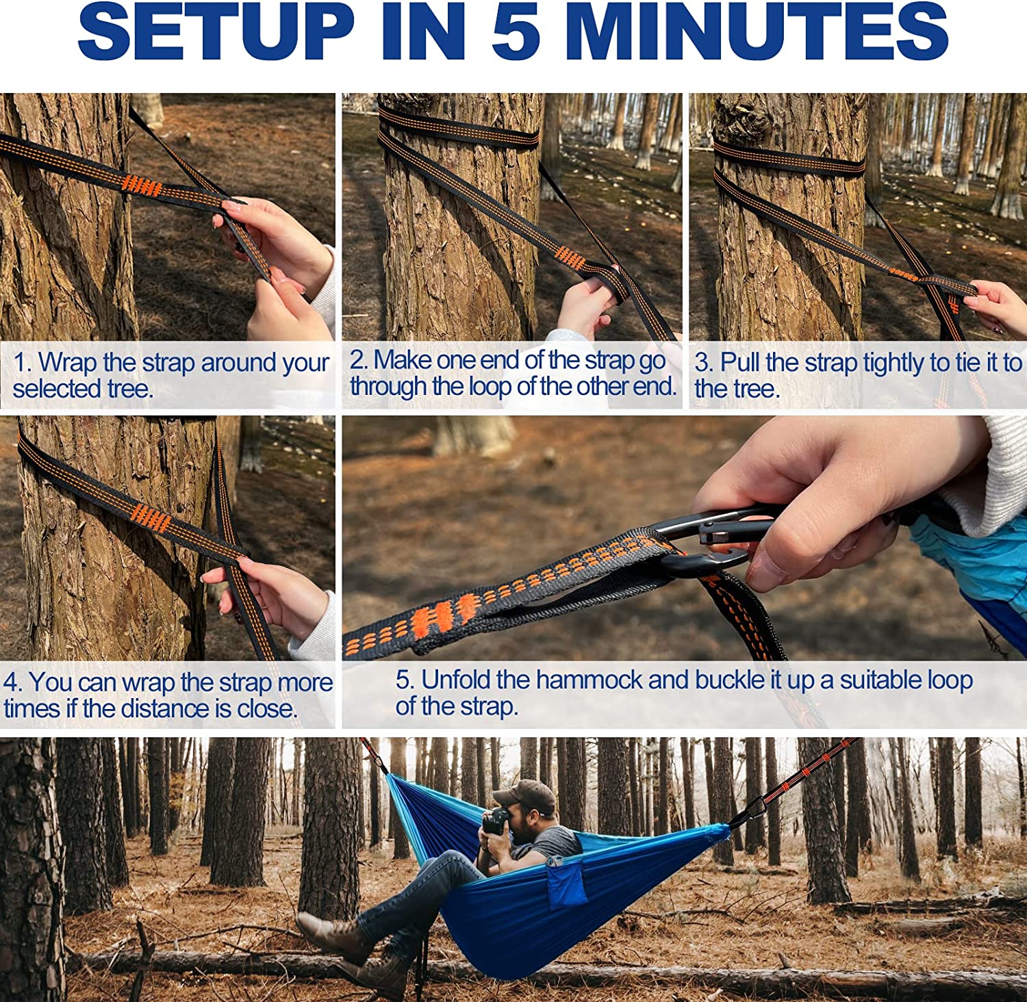 【Adjustable Tree Straps】: The hammock comes with two adjustable 10-feet long tree straps equipped with 5+1 attachment loops. This design not only makes the hammock more convenient to hang but also protects the tree from damage caused by rope friction.