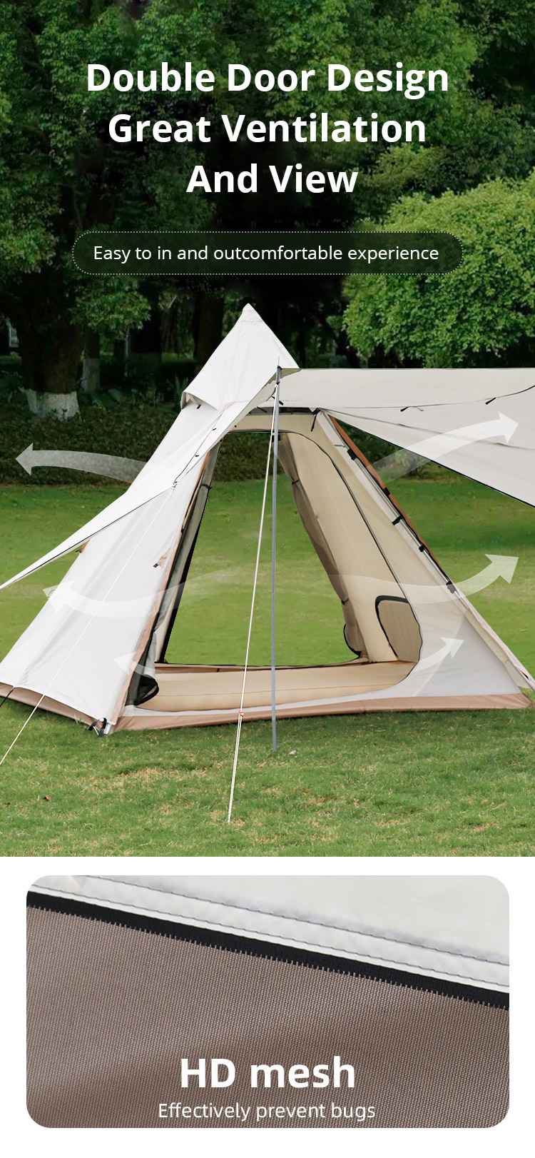 FRONT ROOM: Equipped with a large U-shaped door for good ventilation. When the curtain is unfolded, you can build a front room, put tables, cups, and snacks, and enjoy the time of heart-to-heart talks between family and friends in nature!