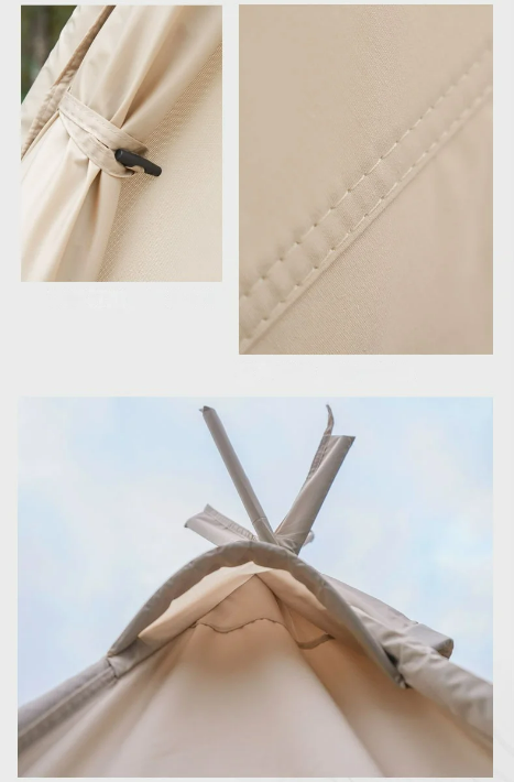SIZE: Open dimension of 150cm (Length) x 150cm (Width)x 160cm(Height). Square base with pyramid shape. Can accommodate 2 kids , The door is 59cm(W) and 73cm(H). MATERIAL: 210gsm beige cotton canvas with waterproof PU 500mm coating of tent body and non-detachable 300D oxford ground sheet; 4pcs diameter 19mm galvanized steel tube as support pole. FEATURE: Easy to set up and strong stability. Just insert all the poles into the sleeves and fix the pole ends on the ground, then configure the top sticks in a circular clockwise order and tie them up. Using the pegs and ropes to fix the tent more stable. It also can be used indoor, but you can not fix the pegs. 1 DOOR: There are four ventilation holes on the top of the tent to circulating air and keep breathable. one doors 2 windows for easy access and both canvas flap doors with mesh screen. The flap can be rolled to one side to open the door. REMARK: Advisable to use this tent in the sunny days. The seams at the top intersection may can't be sealed total with waterproof PU coating due to structural issue. So the top may leak in the heavy rain. Please keep the tent clean and in bone-dry conditions when store it. We just sell tent, exclude any decorative furniture.