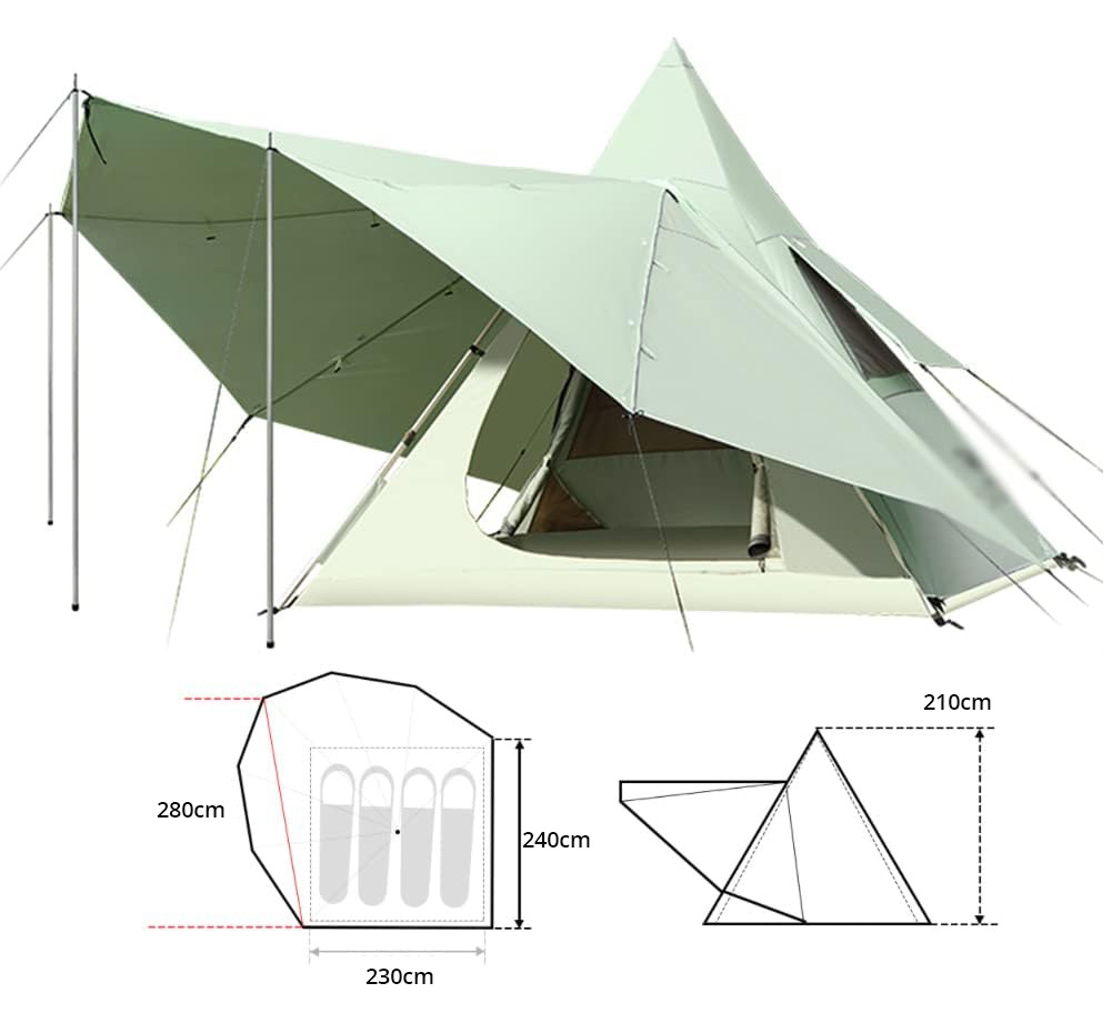 MAXIMUM CAPACITY: With a dimension of 280*240*210CM/300*240*210CM, It accommodates 3-4 adults standing upright in the tent without bumping the roof. The teepee shape provides generous height allows you to go in and out without feeling restricted.
