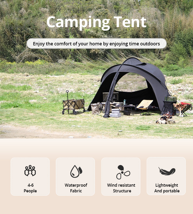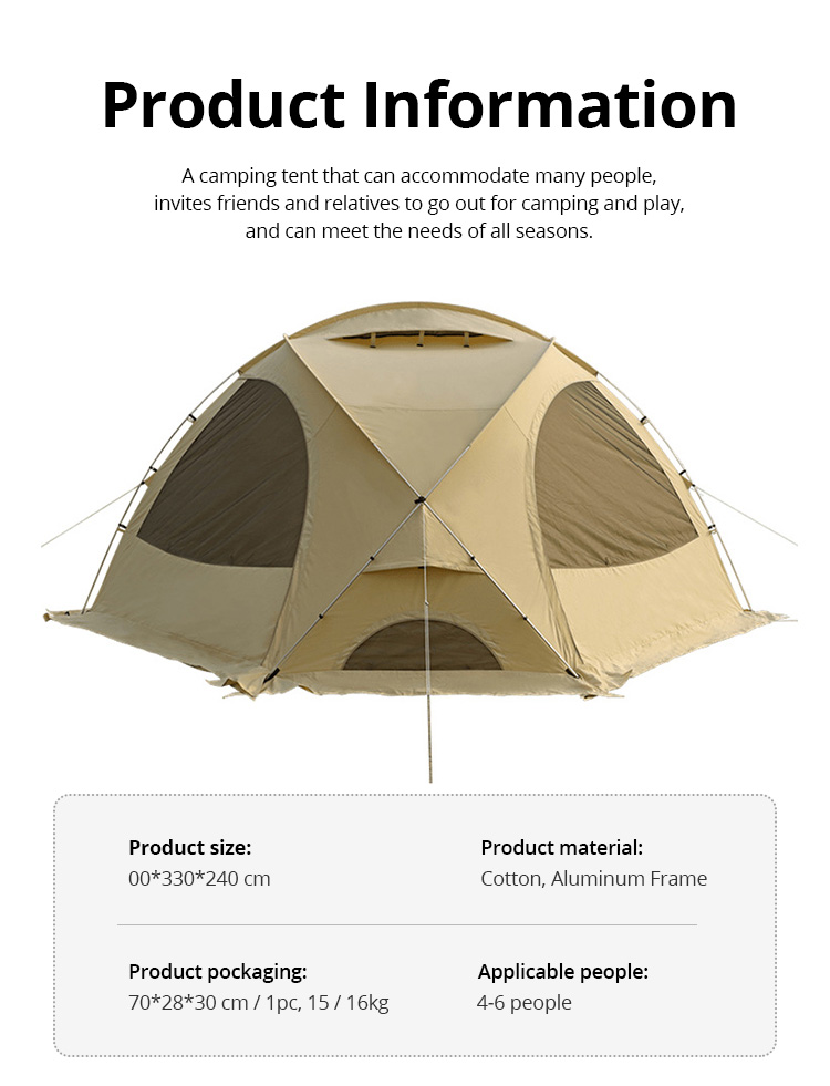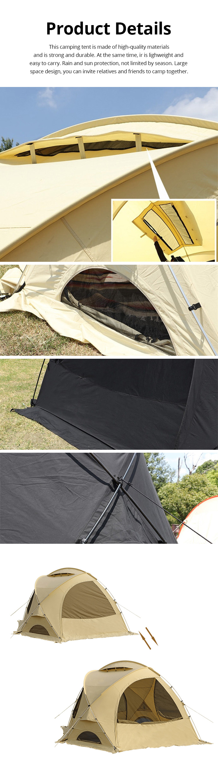 The polycotton material used in this shelter possesses remarkable light-shielding and hygroscopic properties, making your camping experience even more enjoyable. It allows you to stay cool during summer and warm in winter.