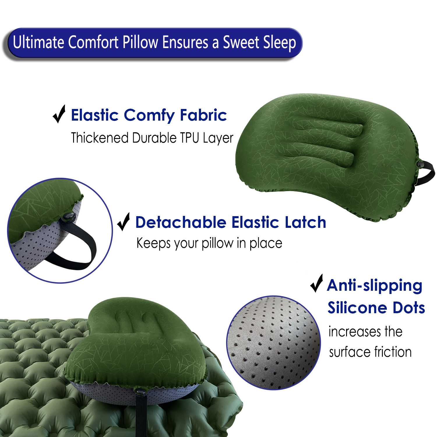 Guaranteed No-Leak Design: Unlike many inflatable pillows that lose air over time, our pillow undergoes rigorous leak-testing at our factory. Using a standardized pressure machine, we ensure each pillow maintains its inflation for over 24 hours. Any pillow that leaks is removed at the source, guaranteeing that your comfort won't be compromised during your outdoor adventures. Whether you're backpacking, hiking, or traveling by car or plane, we assure you both comfort and reliability.