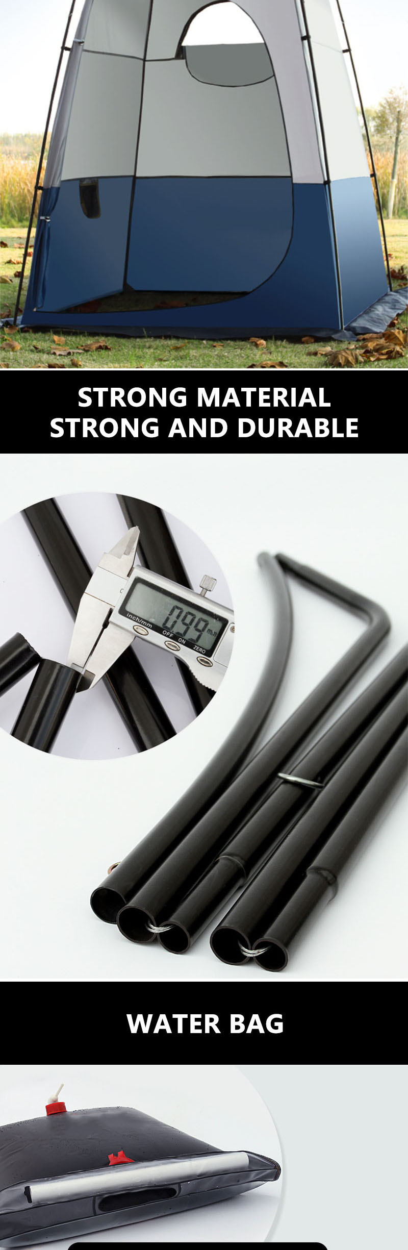 [EASY TO SET UP] This outdoor shower tent is easy to assemble with pole clips that quickly snap over the poles. You will find it very easy to install with 4 steel poles, 2 fiberglass poles, 4 guy ropes, and 8 steel nails. Sturdy camping shower tent poles provide excellent free-standing stability for your outdoor changing tent.