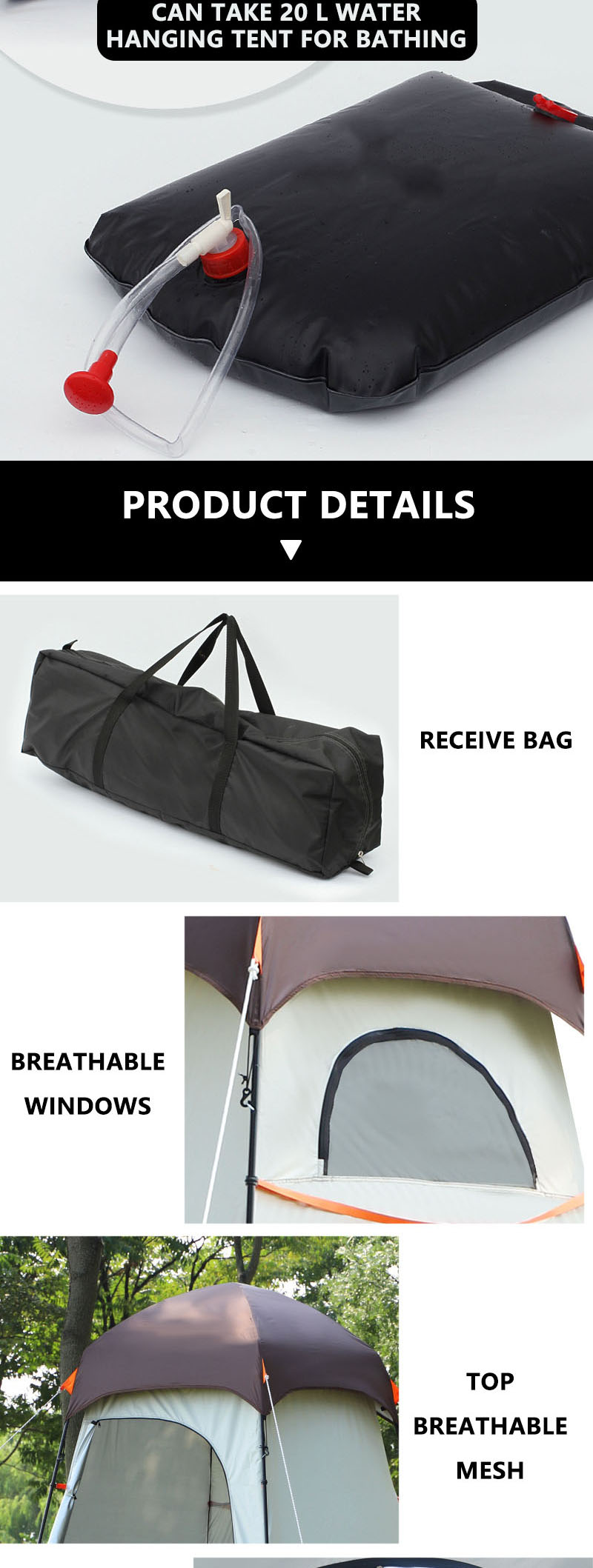 [CONVENIENT OUTDOOR SHOWER TENT] This shower tent includes 2 inner mesh pockets for soapy body wash and toiletries, and 1 strap for hanging clothes and towels; 2 large durable hooks for hanging a solar shower bag and a shower head. The external pocket with a mesh compartment keeps your clothes and towels dry in the shower.