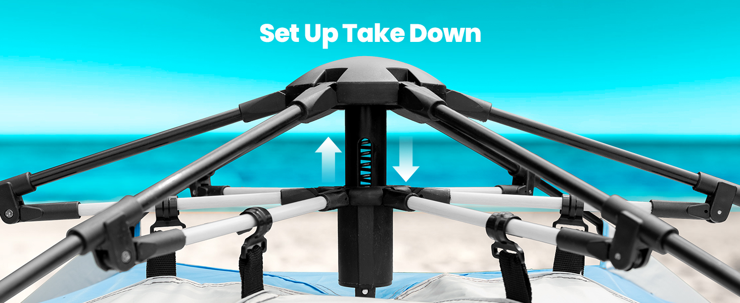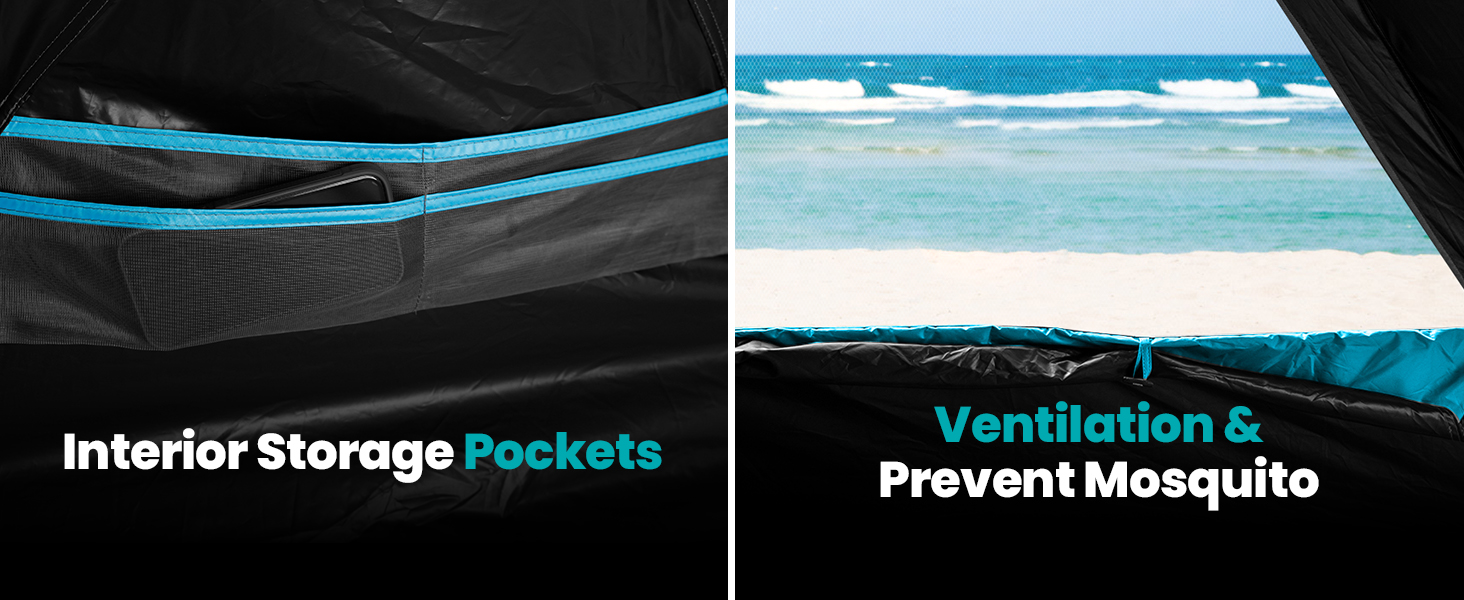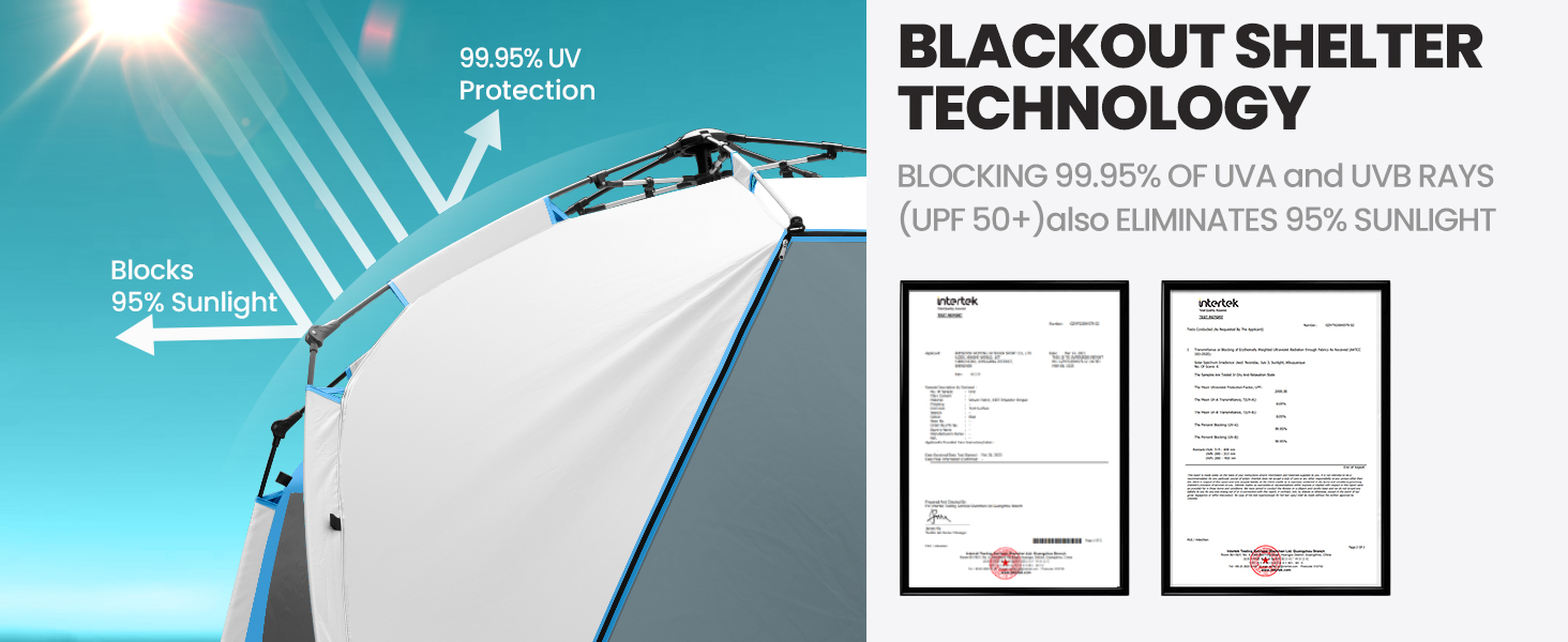 Blackout Shelter Technology: Our instant shade blackout shelter blocks 99.95% of UVA and UVB rays (UPF50+) and eliminates 95% of sunlight. This ensures maximum protection for your skin and belongings, allowing for a more comfortable rest at any time of the day.