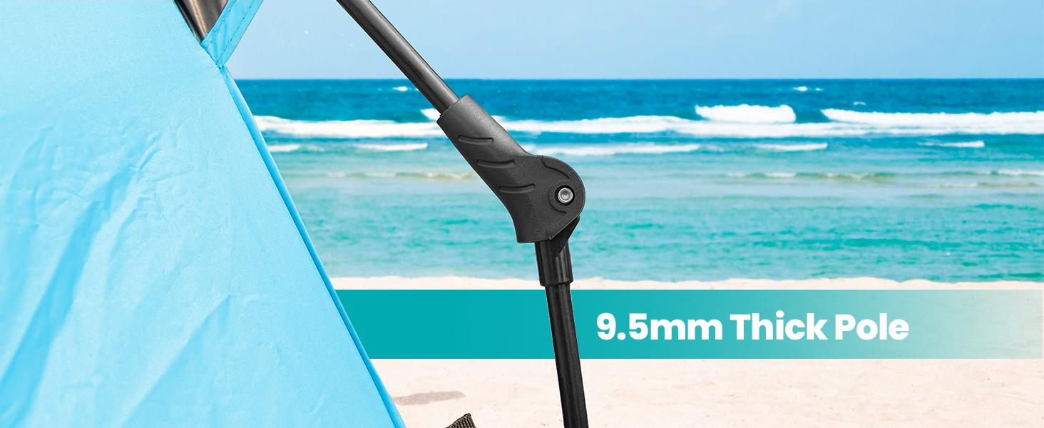 9.5mm Thickened Rods & 190T Material: Featuring upgraded 9.5mm thickened rods (compared to the market standard 8.0mm) and durable 190T Spring Asia Textile, this sun shelter offers superior sturdiness. It remains stable in windy conditions without breaking or tearing.