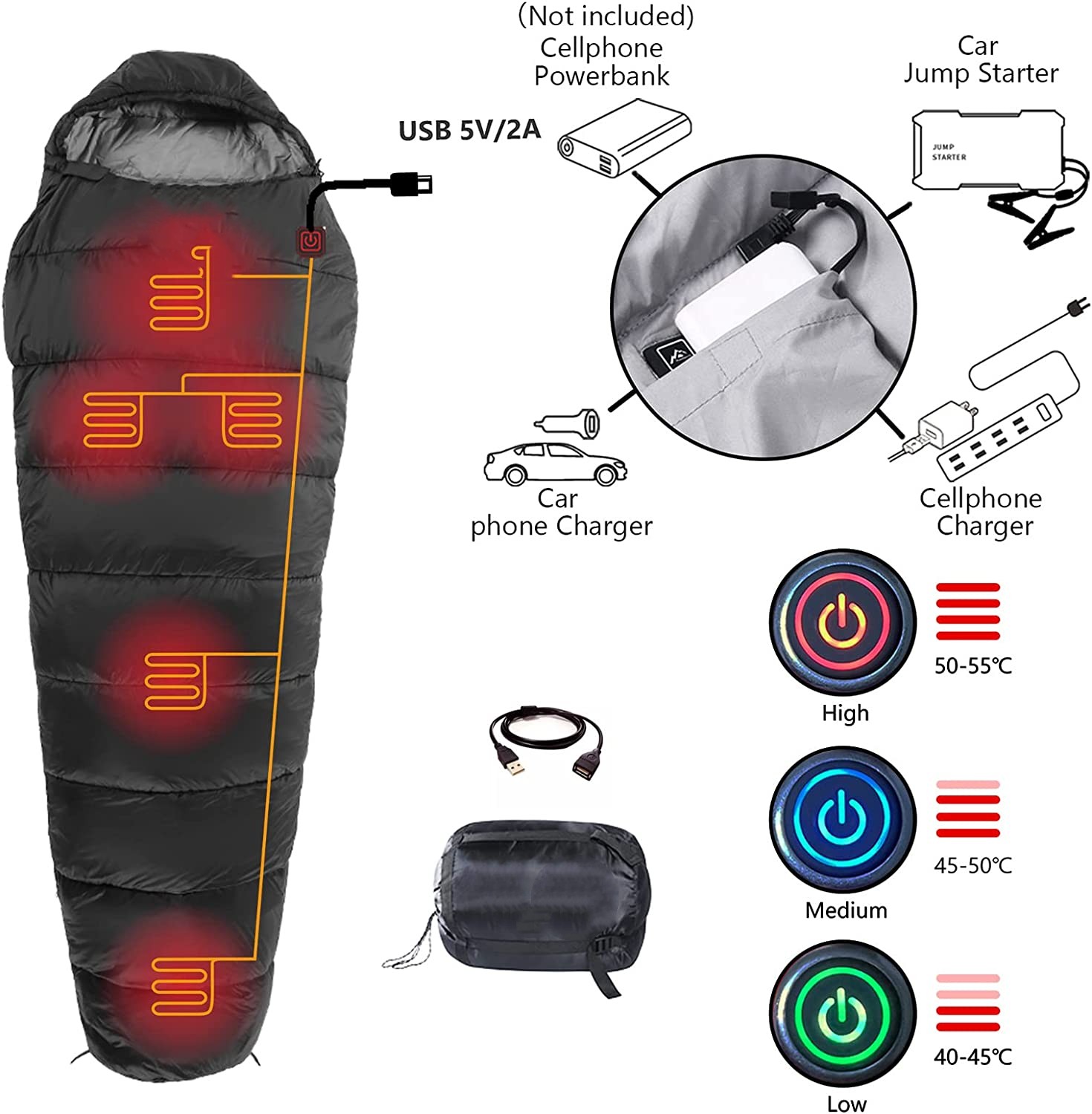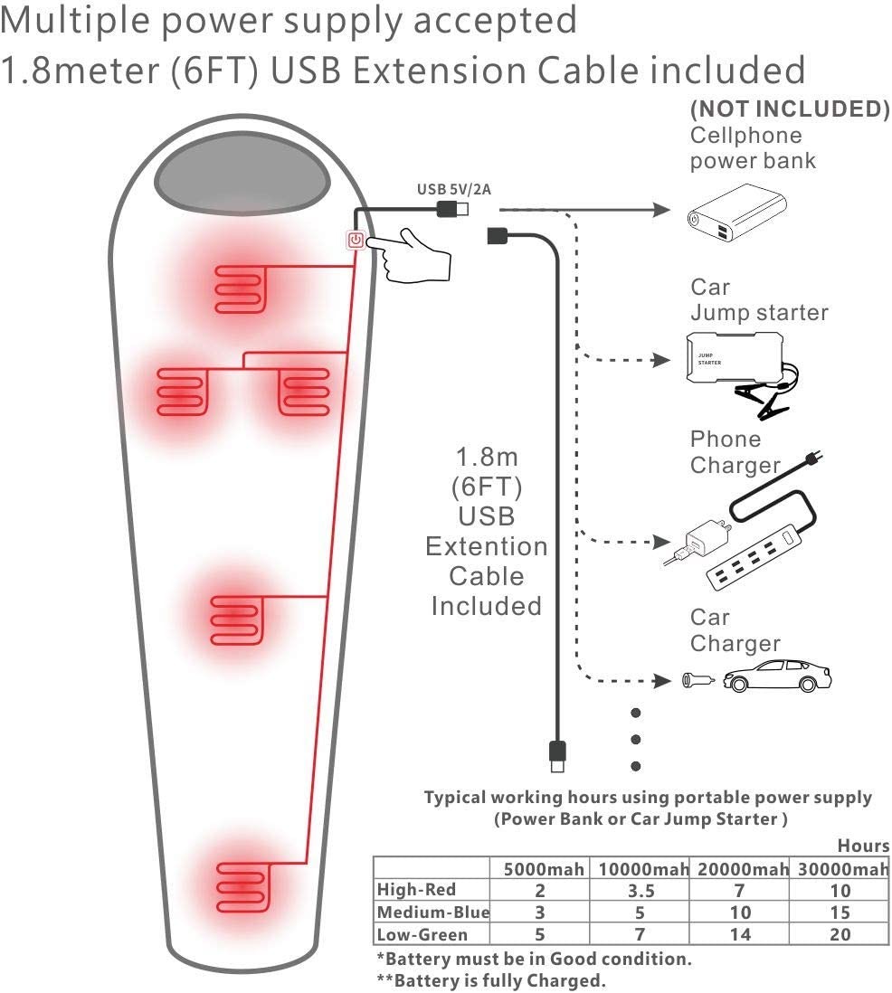 5V USB charging with power bank(3.7v, 7.4v, 12v are optional)